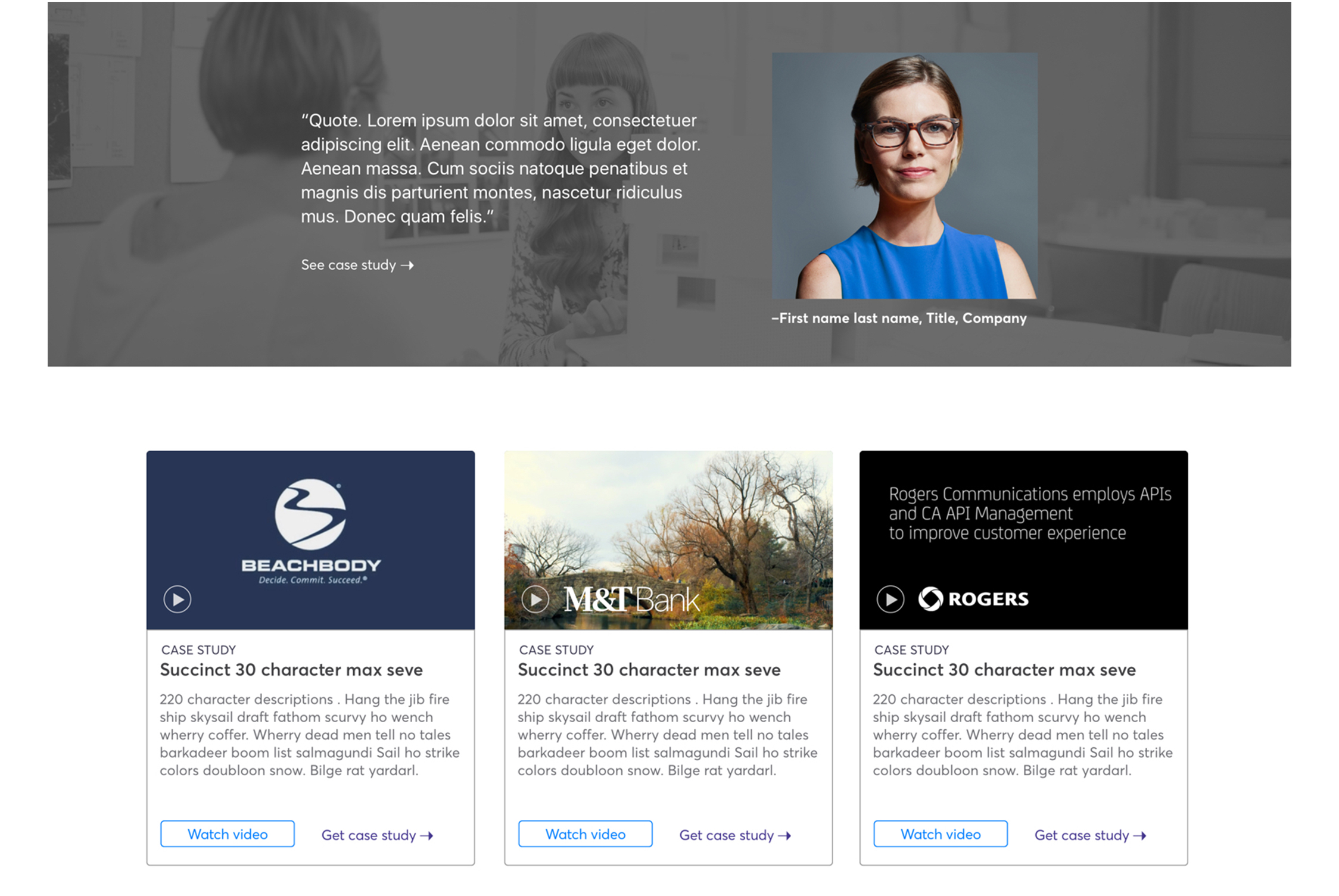 Initially designed for a parallax scroll for what was once called "Thought Leadership", this module became a case study section. CA Tech has a vast amount of case studies for each of their products. The top image shows a mockup for the homepage that would still have parallax scrolling while the bottom mockup was for the category, subcategory and product page.