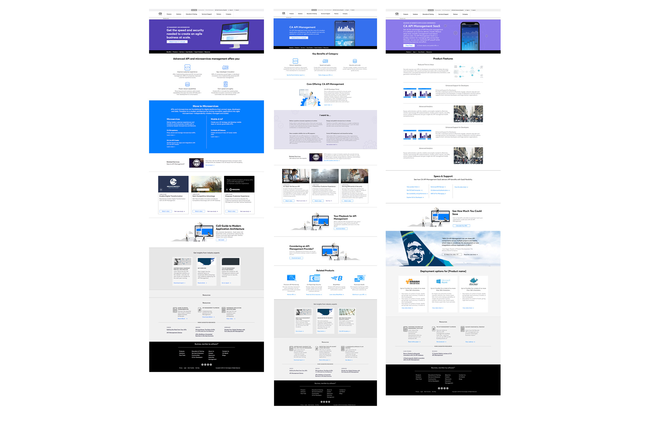 Partnering with the CA Tech Senior UX designer, it was determined this journey can be broken down into three pages: category, subcategory and product. Each of the three pages could be broken down to include pertinent sections such as the submenu, microservices, case studies, customer reviews, industry expert insights and various online resources.