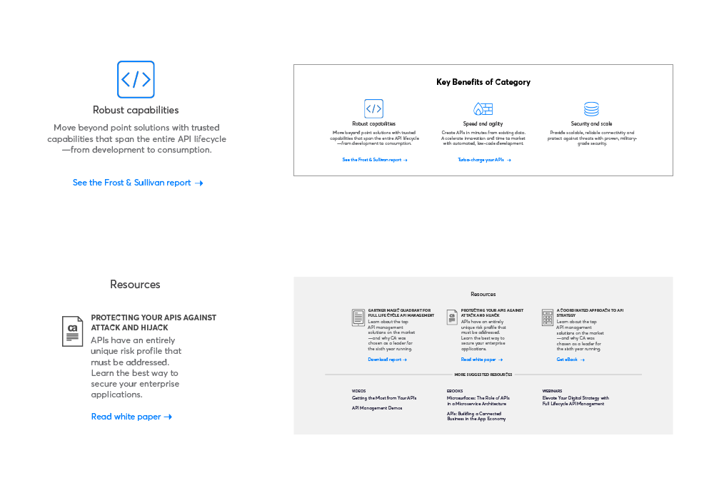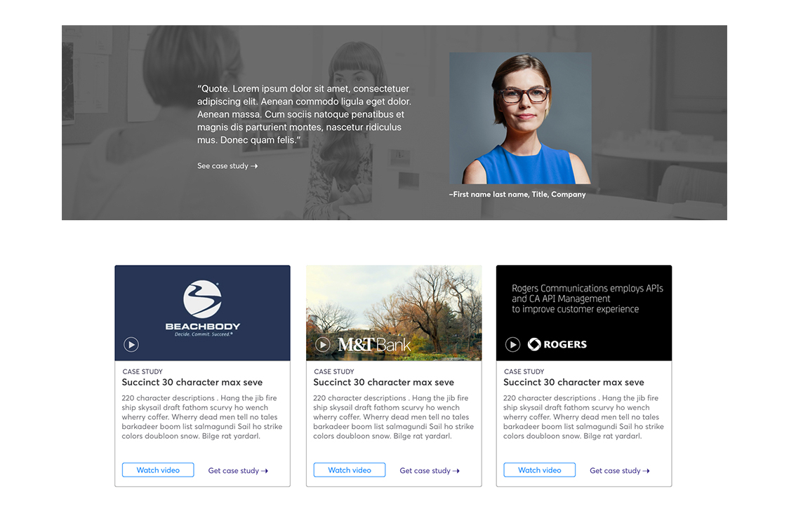 The final pages went live right before Broadcom acquired CA Technologies. Unfortunately because of this, we were not able to finish the project in full. The intent was to build the user experience from the bottom up. This way, once the homepage refresh was done, all the content would be there for the full user experience. The hompage redesign was not completed and the APIM category, subcategory and product pages went through a Broadcom branding update.